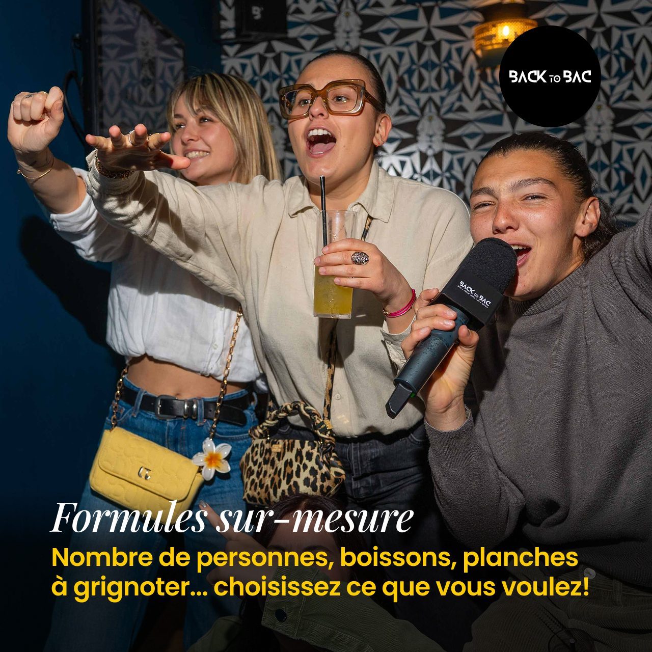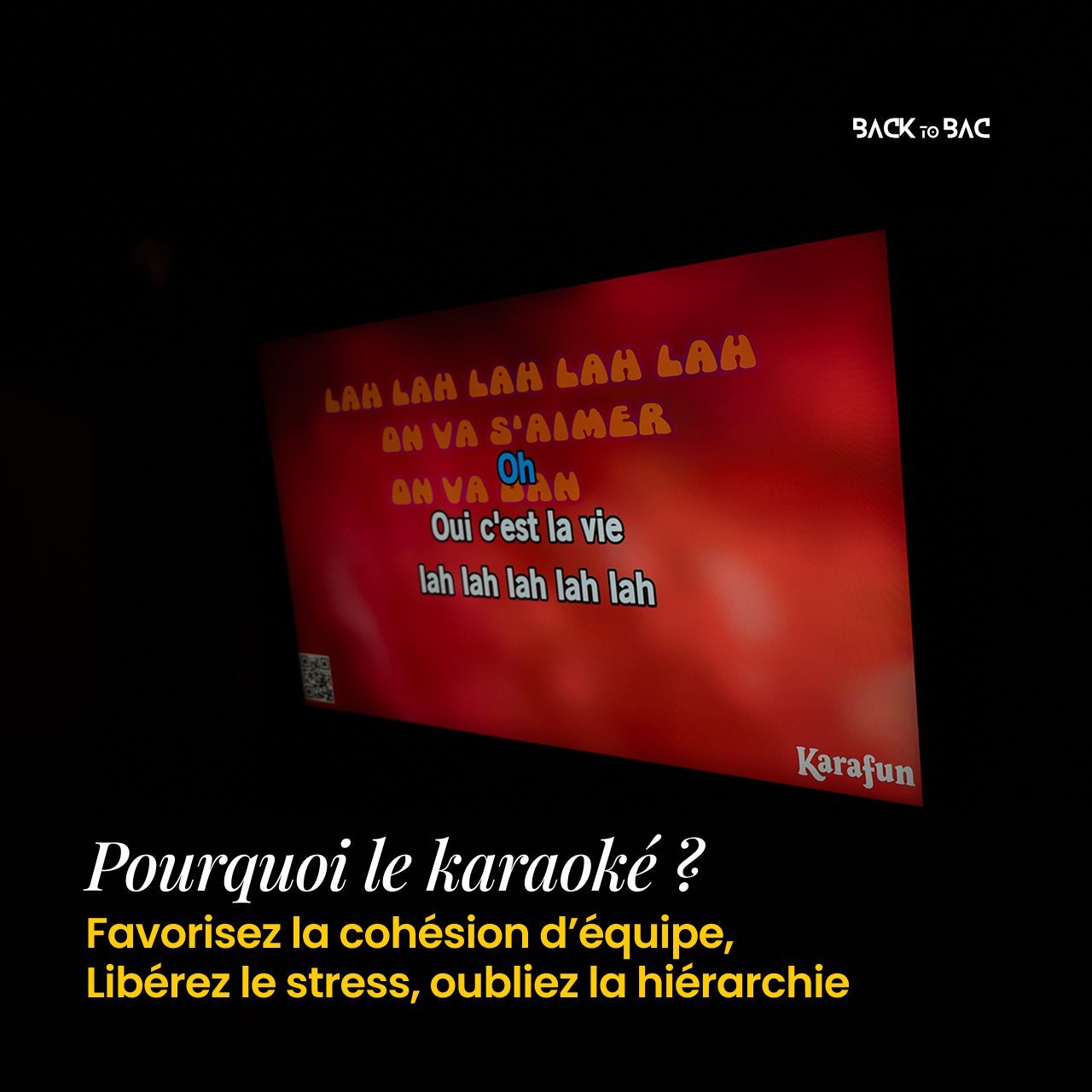 Ne cherchez pas plus loin! Nous avons la solution parfaite pour vous : BACK TO BAC ! Organiser une soirée de karaoké pour votre équipe est non seulement un excellent moyen de favoriser la cohésion d’équipe, mais aussi de libérer le stress et de laisser libre cours à la créativité. En plus, nos formules clé en mains vous facilitent la vie et vous assurent une organisation simple et rapide.